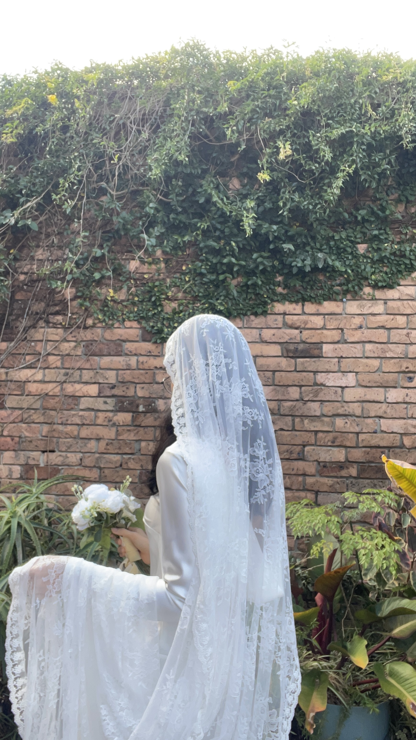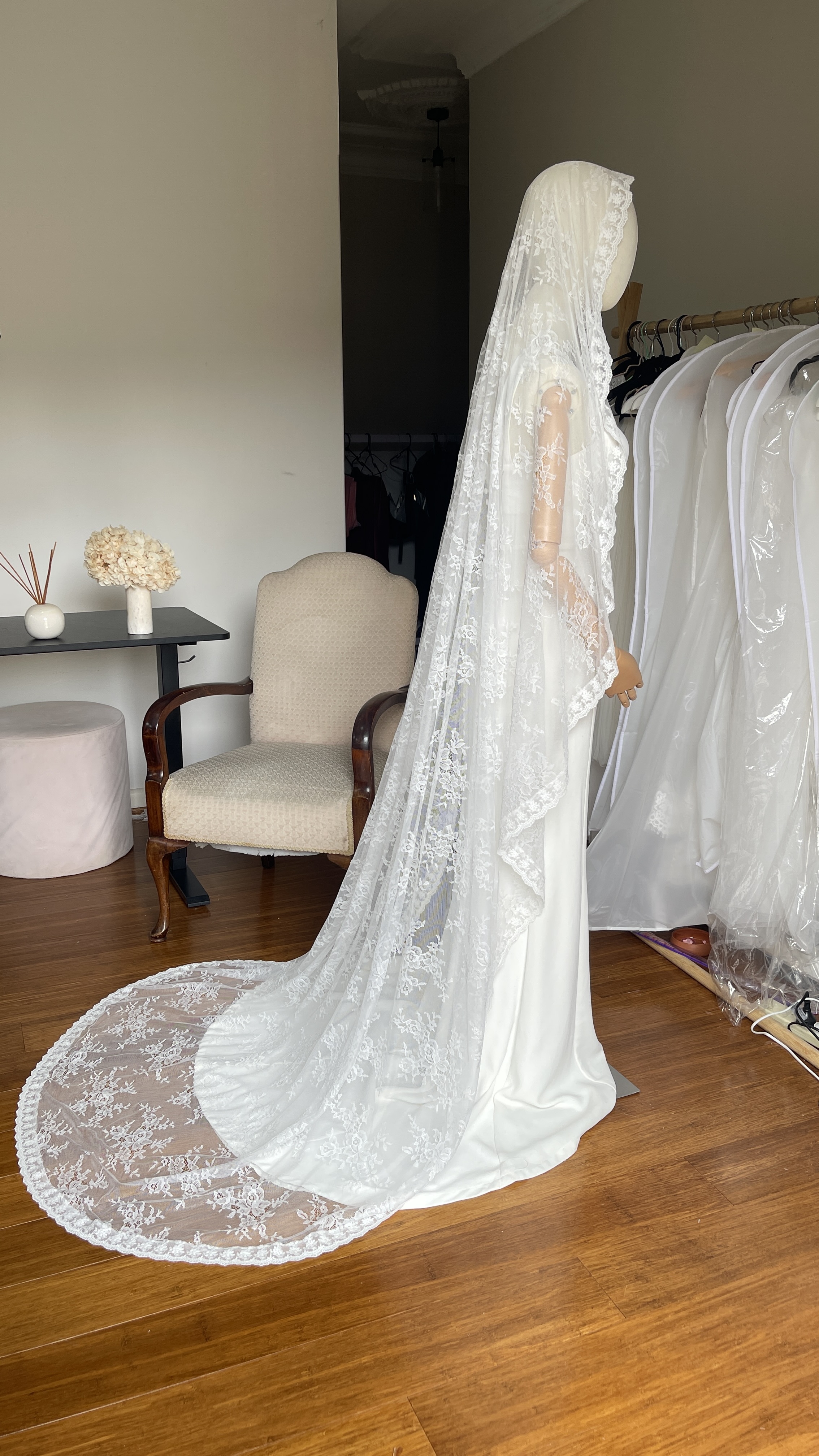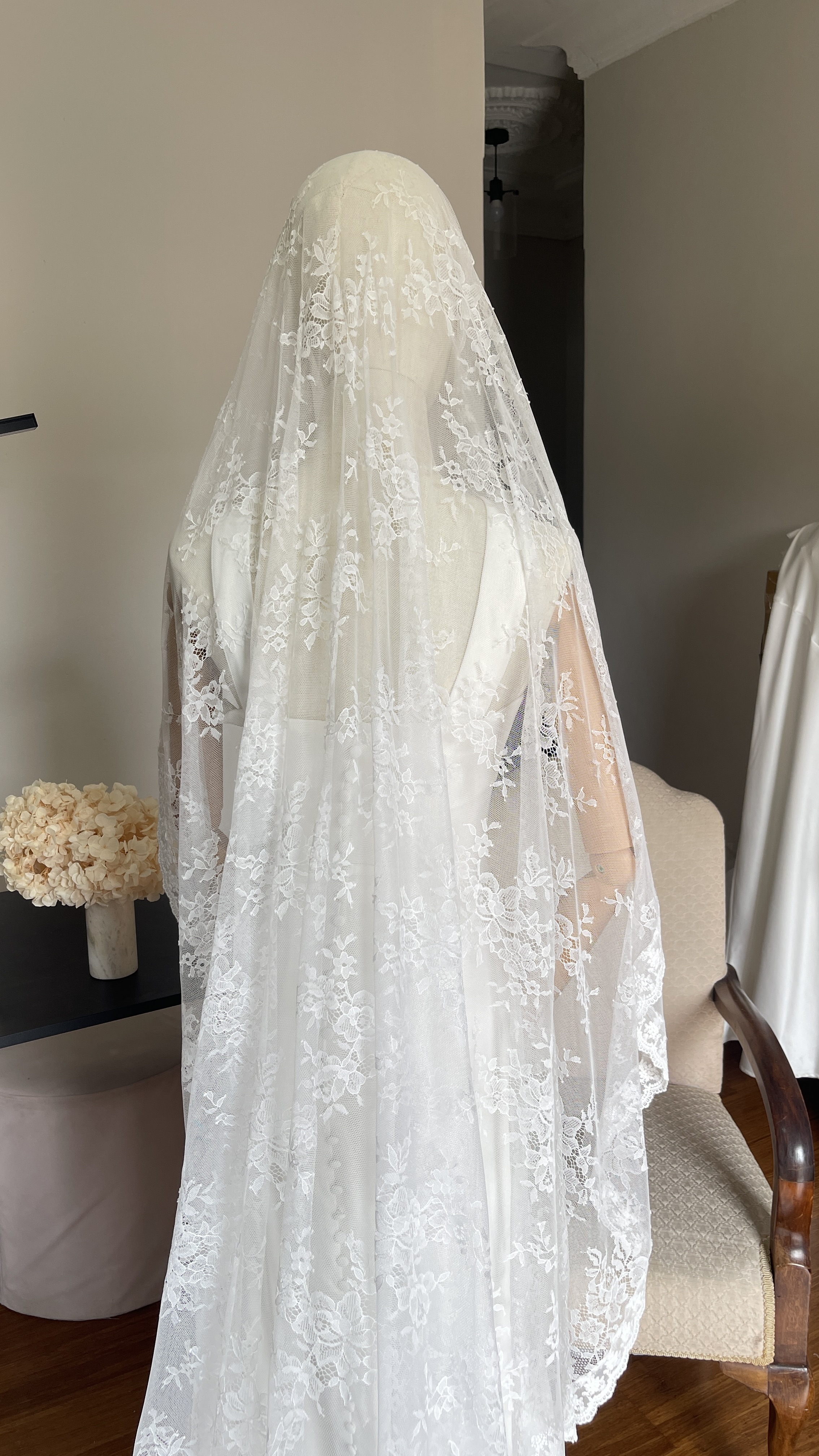 Romantic and richly detailed, this full lace veil makes a statement with every step. A dramatic yet timeless piece for the bride who loves classic beauty with a touch of grandeur.