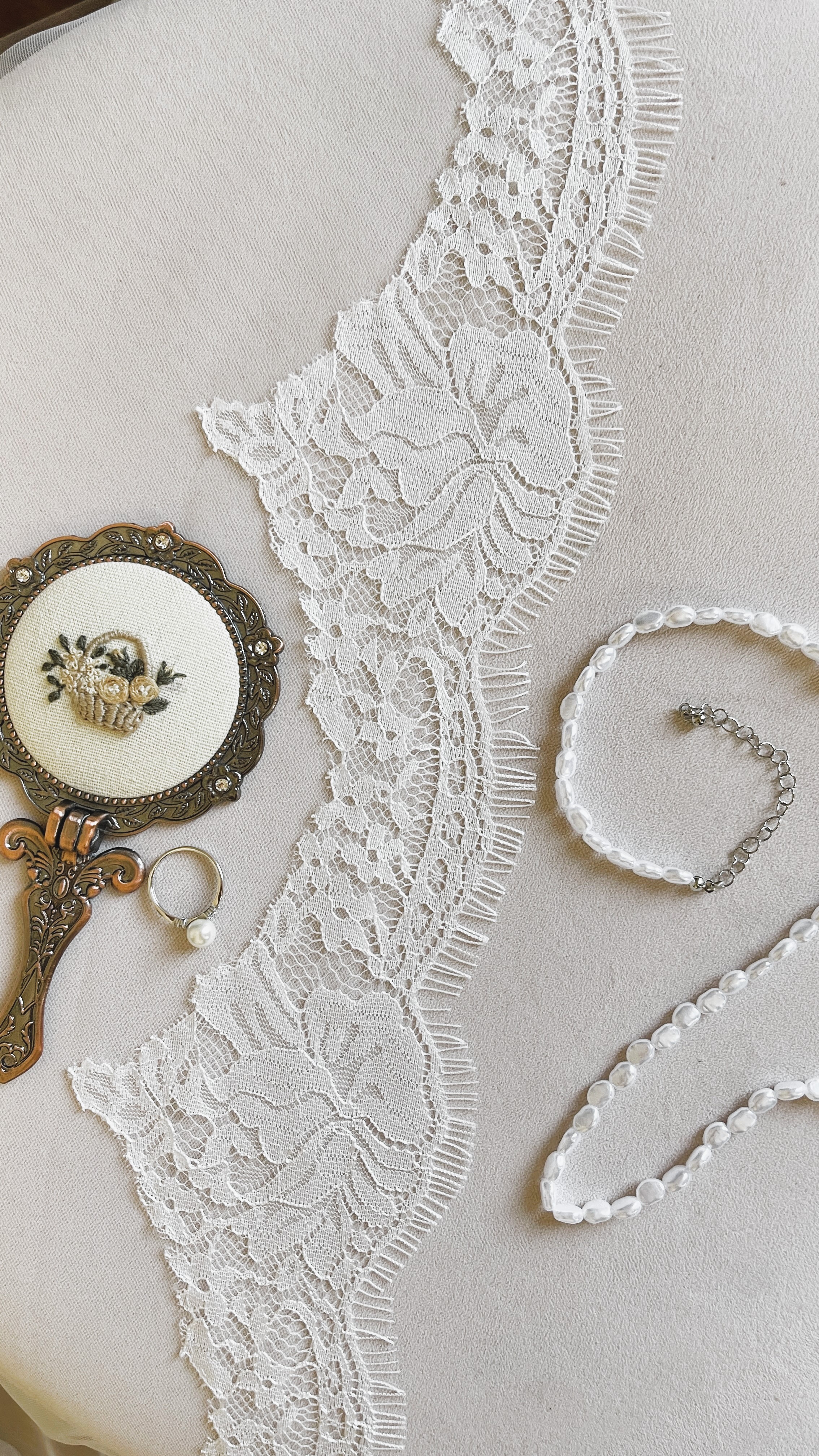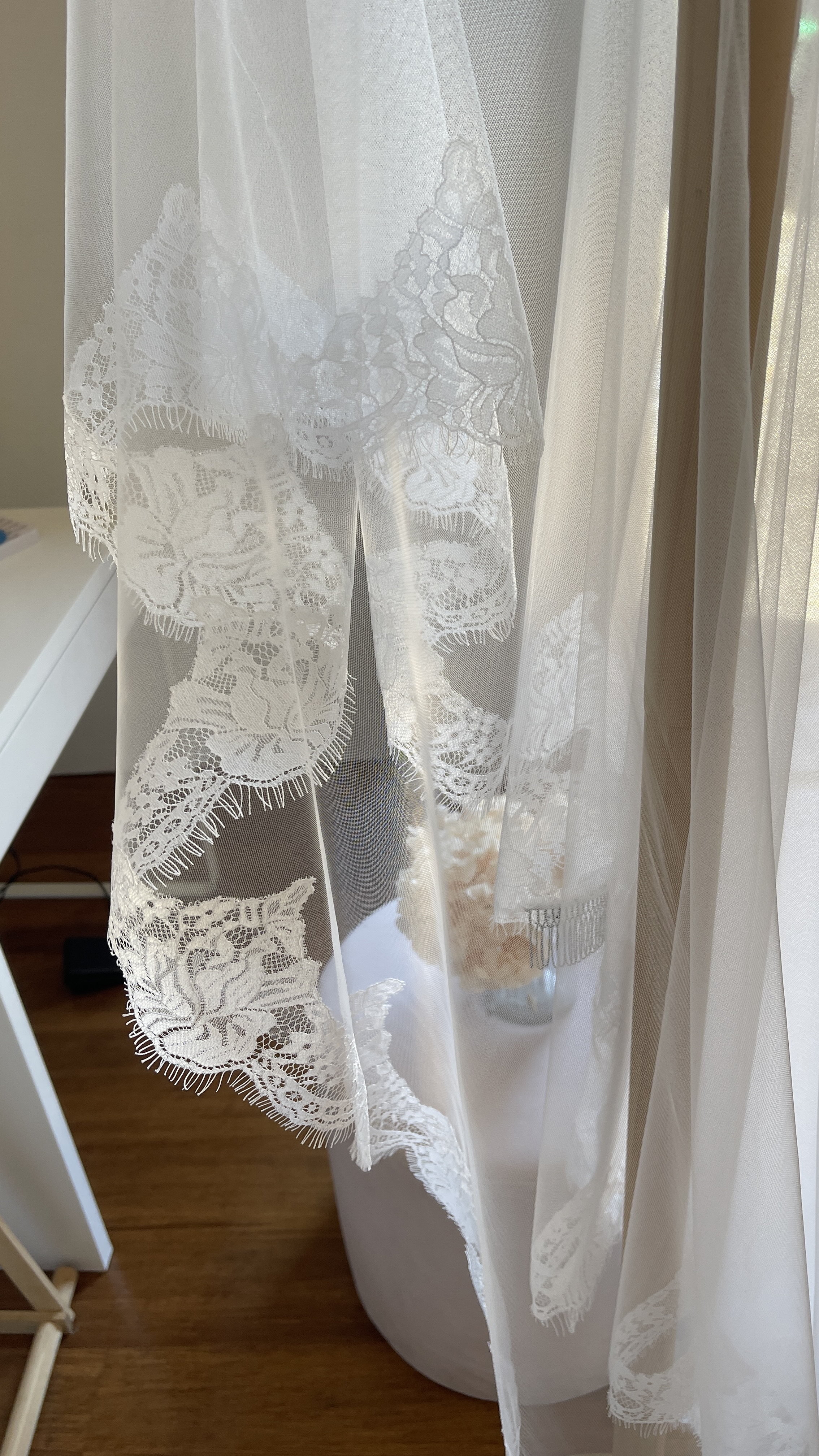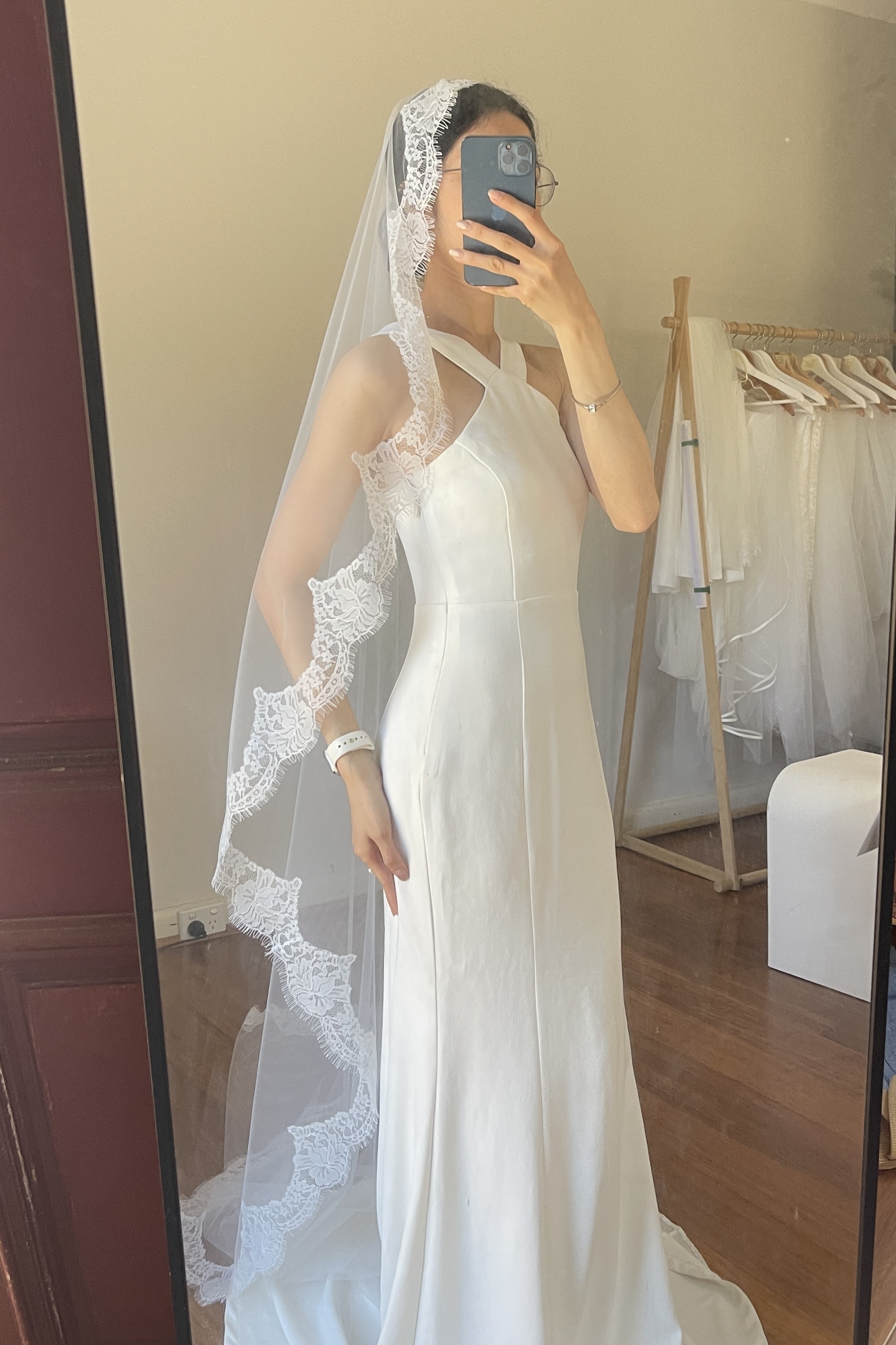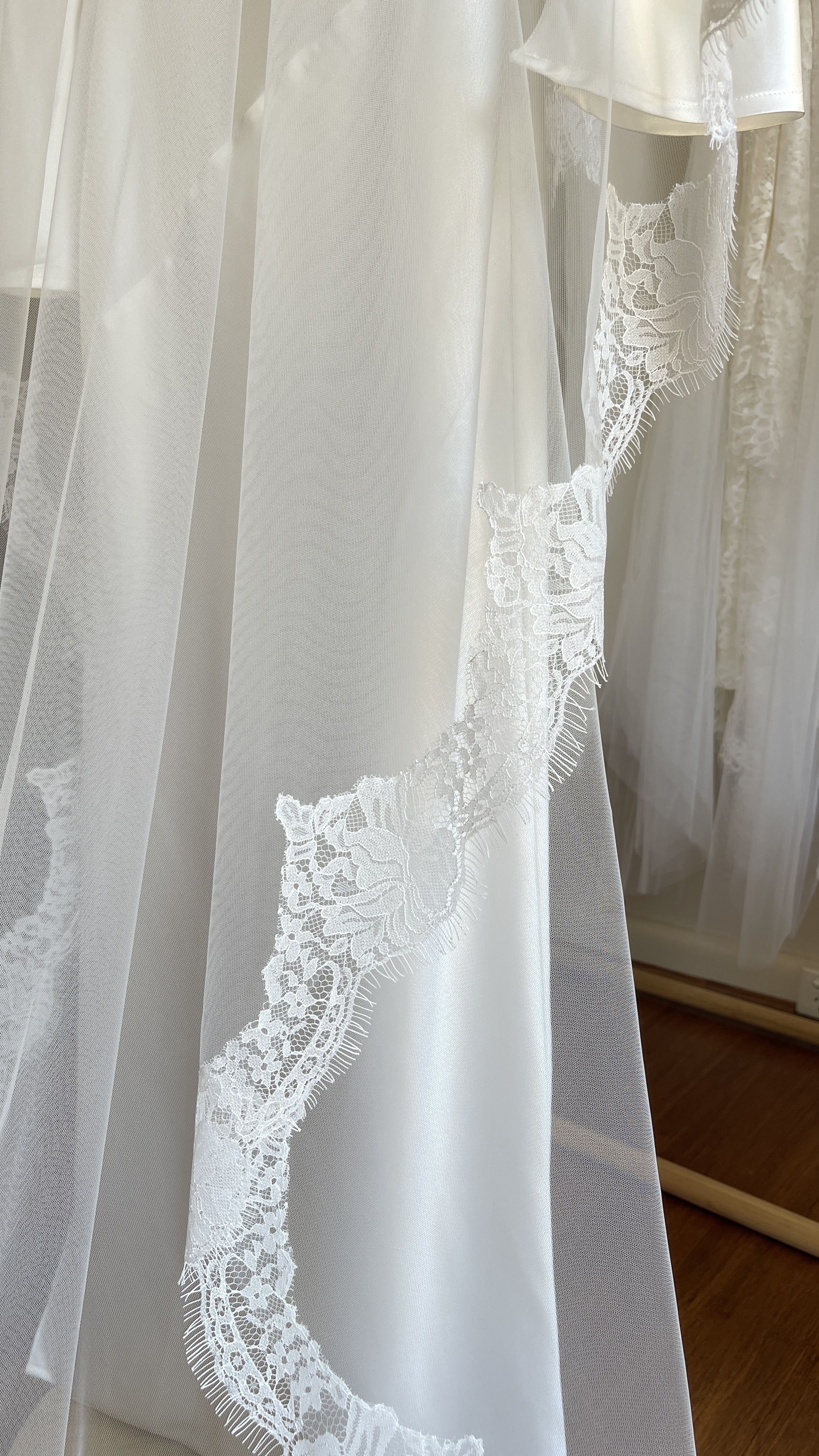 A modern take on the classic Mantilla veil, finished with fine lace trim for a romantic, couture-inspired touch. Light and romantic, it brings a touch of couture elegance to your bridal look with timeless charm.