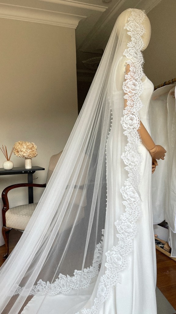 A modern take on the classic lace veil, finished with scalloped French lace for a romantic, couture-inspired touch.