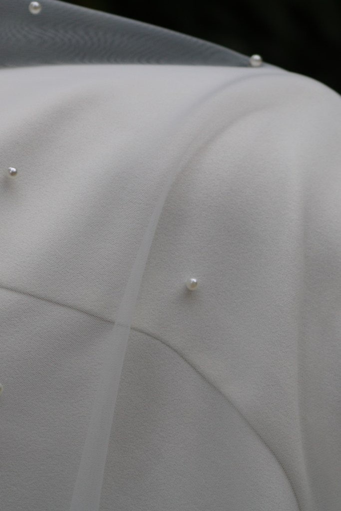 - Mini pearls scattered throughout the veil