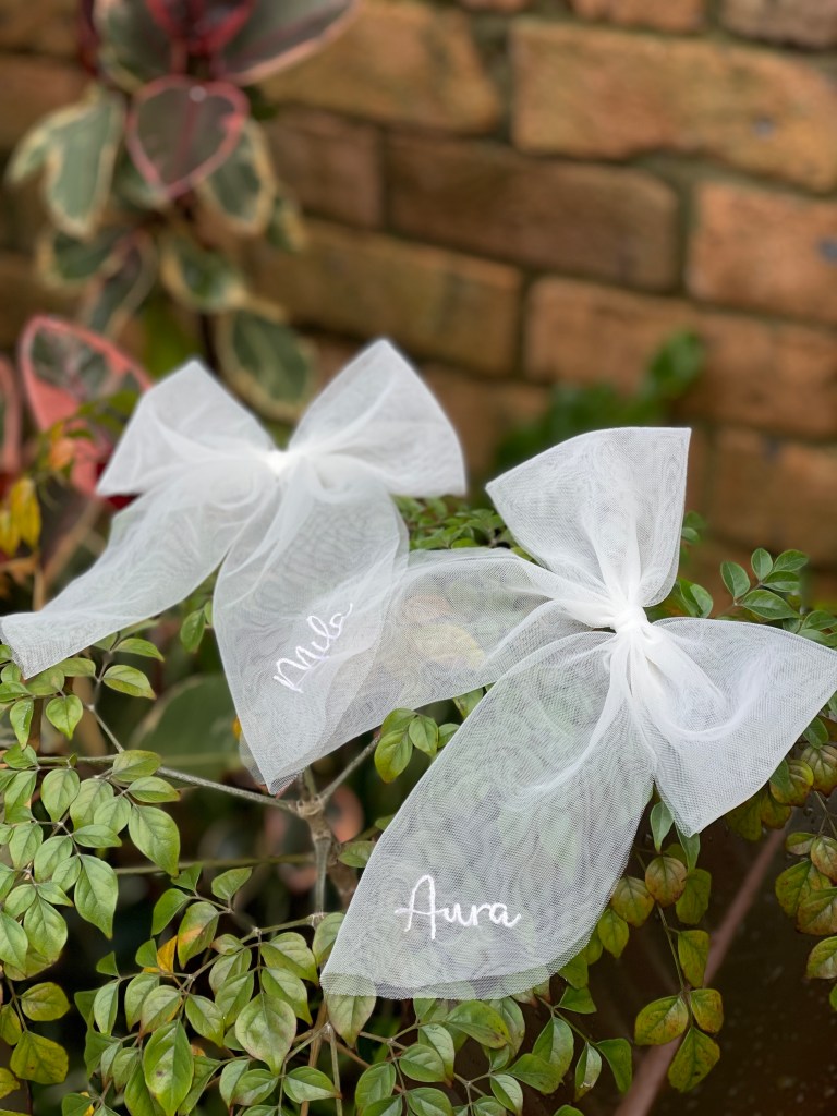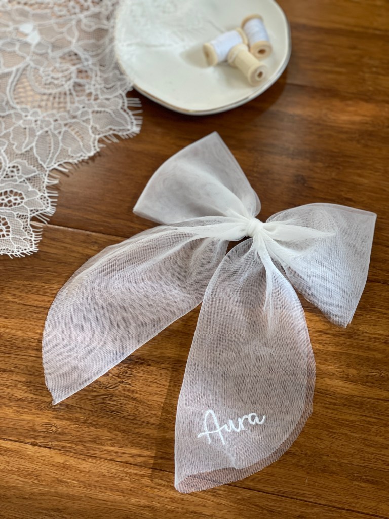 - Tulle bow with name embroidered: $80