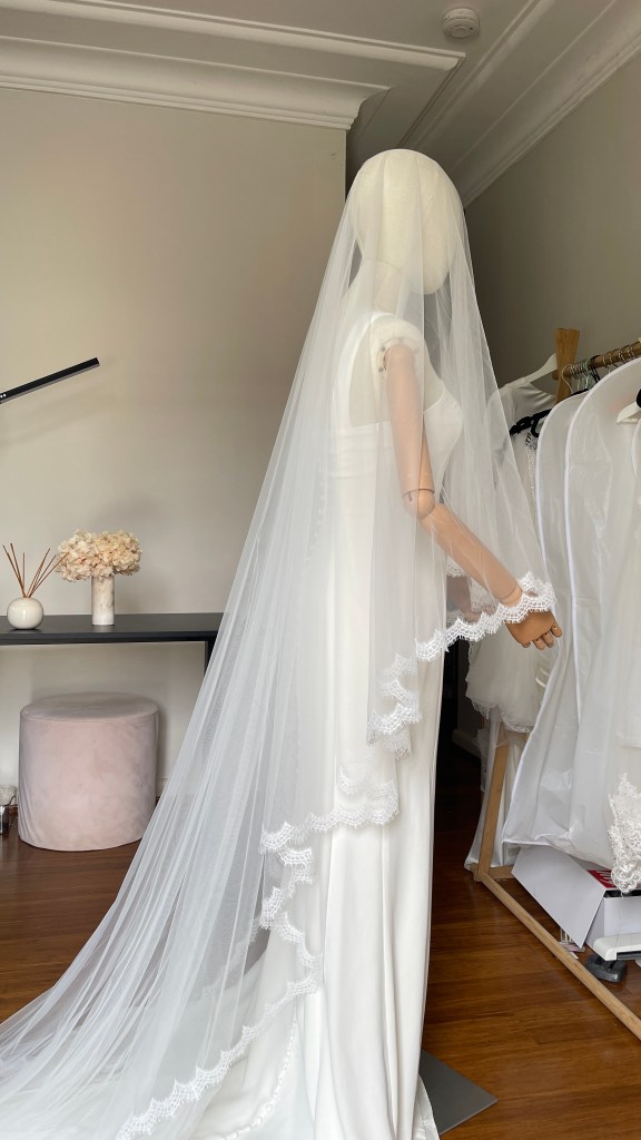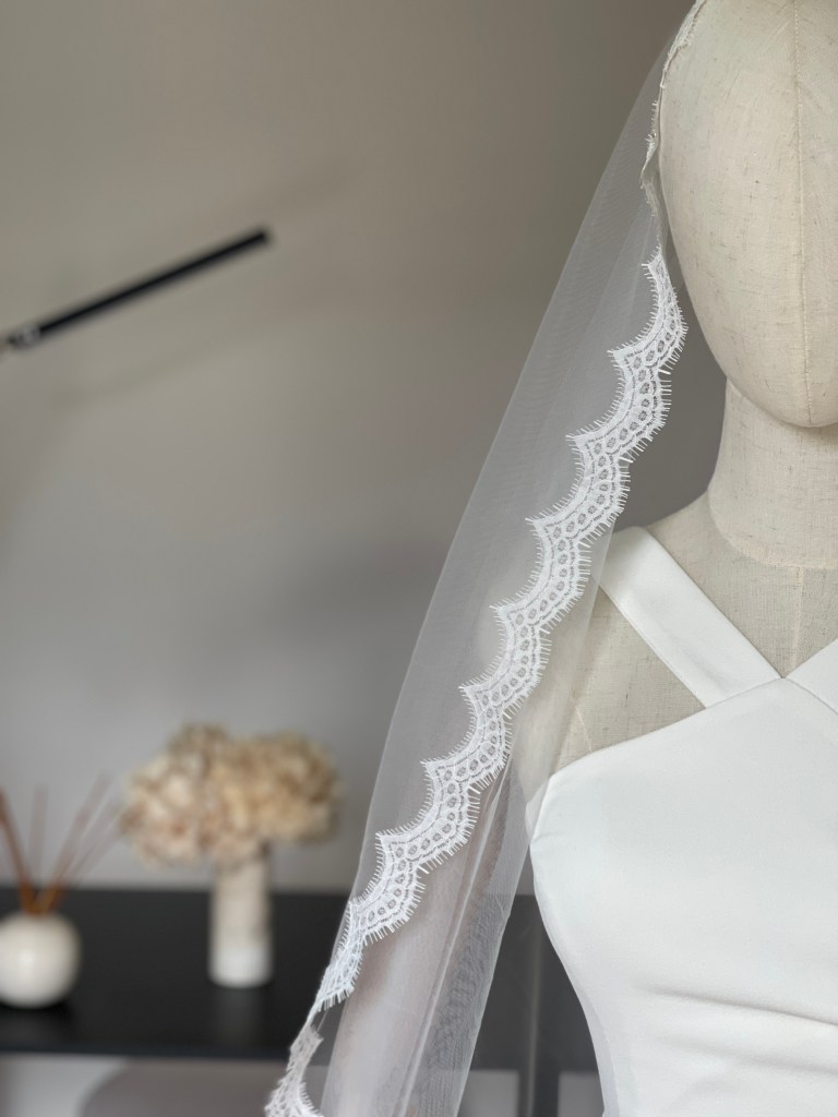 Sally is a modern take on the classic lace veil, finished with thin lace trim for a romantic, couture-inspired touch. Light and romantic, it brings a touch of couture elegance to your bridal look with timeless charm.
