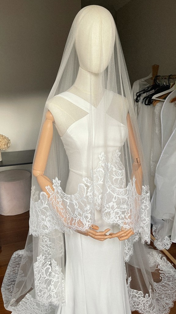A modern take on the classic mantilla veil style, finished with fine Chantilly lace trim for a romantic, couture-inspired touch. Light and romantic, it brings a touch of couture elegance to your bridal look with timeless charm.
